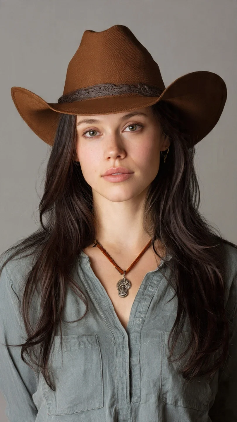 Women wearing a stylish brown cowboy hat with a wide brim and classic Western design