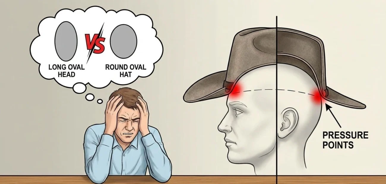 When you put a Round Oval hat on a Long Oval head, the hat presses hard against your forehead and the back of your skull, while leaving gaps on the sides above your ears. That pressure points on the forehead is what causes the infamous “hat headache.”